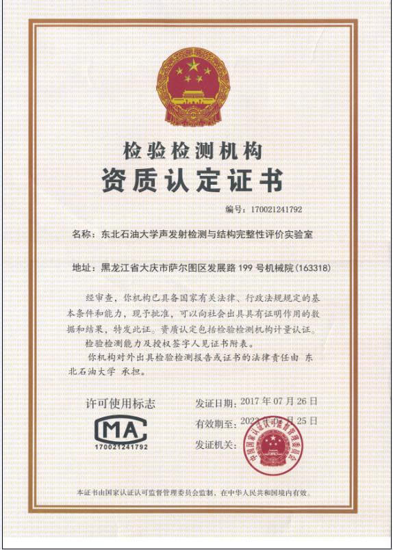 东北石油大学声发射检测与结构完整性评价实验室是我国最早开展大型储罐声发射在线检测理论和应用技术研究的单位。实验室创建于1983年,主要从事石油、石化领域中的重要设备、管线的动、静态检测和评价技术研究与应用工作。该实验室由声发射检测室、超声检测室、磁检测室、应变检测室、仪器开发室和管理室构成。1998年6月通过国家技术监督检验检疫总局计量认证评审,是我国声发射检测与评价领域最早通过国家计量认证的实验室,中国石油安全环保技术研究院HSE重点实验室,2013年与美国物理声学公司(PAC)合作共建了现代无损检测技术实验室,2018年通过了质量管理体系、职业健康安全管理体系、环境管理体系的认证。