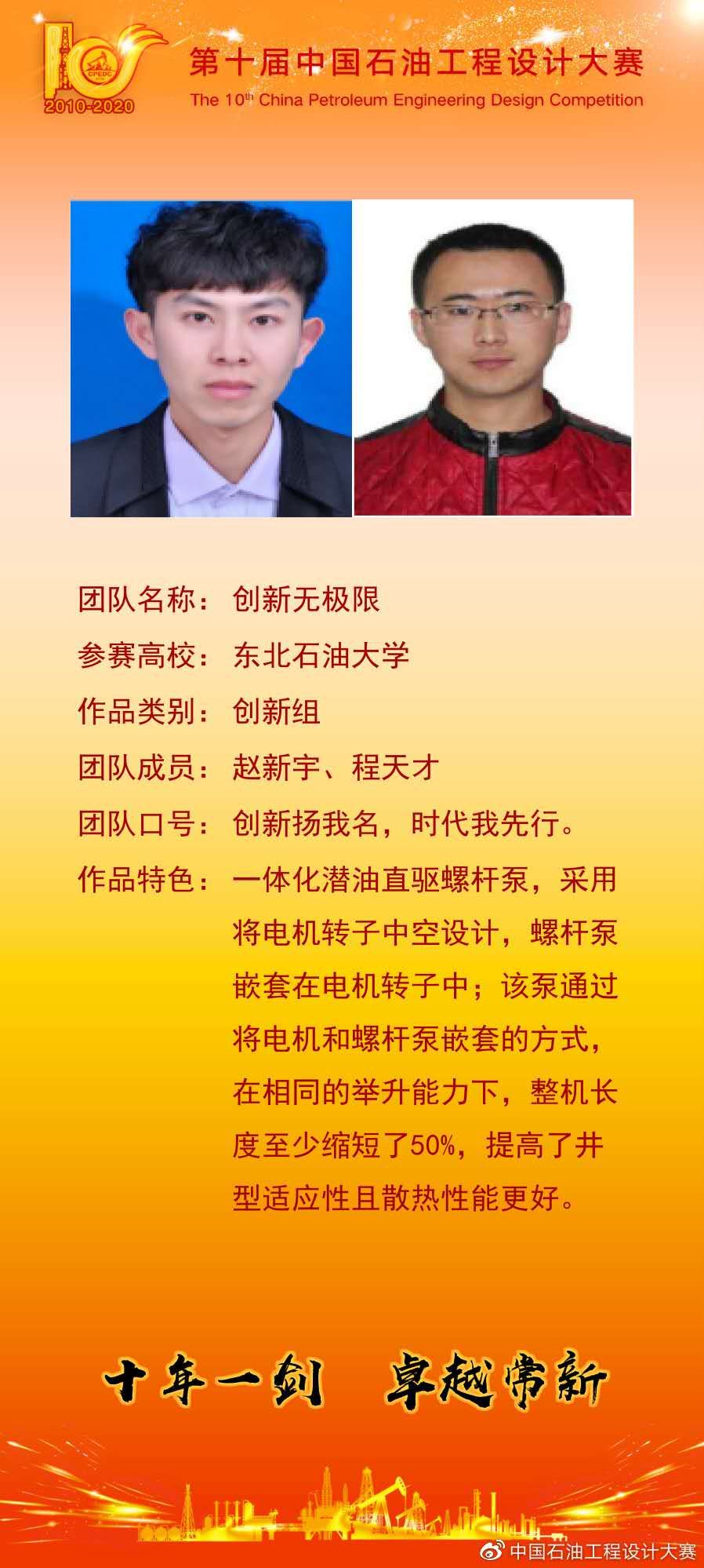 2020年6月13-14日,第十届中国石油工程设计大赛决赛在线上平台顺利举行。共有来自国内27所高校、国外5所高校的5000余名学生和700余名指导教师参与,提交有效作品979份,74支队伍入围全国总决赛。来自中国石油天然气集团公司、中国石油化工集团公司、中国海洋石油集团有限公司和斯伦贝谢公司的61名专家组成专家组,对入围全国总决赛的作品进行评审,评选出一等奖21项,二等奖49项,三等奖4项,我校共获方案设计组二等奖6项。其中由威廉官网中国官方网站赵新宇和程天才等研究生所完成的“机泵同体潜油直驱螺杆泵”、王中杨和胡金兆等研究生完成的“一体智能高效化精细分注装置”项目获得方案设计类二等奖,董康兴、王宝金两位老师获得优秀指导教师奖。