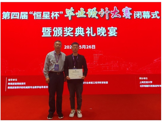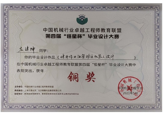 2021年5月25~26日,由教育部高等教育司与教育部高等学校机械类专业教学指导委员会指导,中国机械行业卓越工程师教育联盟主办、上海交通大学和北京精雕科技集团有限公司承办的中国机械行业卓越工程师教育联盟第四届“恒星杯”毕业设计大赛,在上海交通大学成功举办。威廉官网中国官方网站机械科学与工程学院的贾光政教授指导、左建坤同学完成的《修井作业油管移运机器人设计》喜获大赛个人项目铜奖。