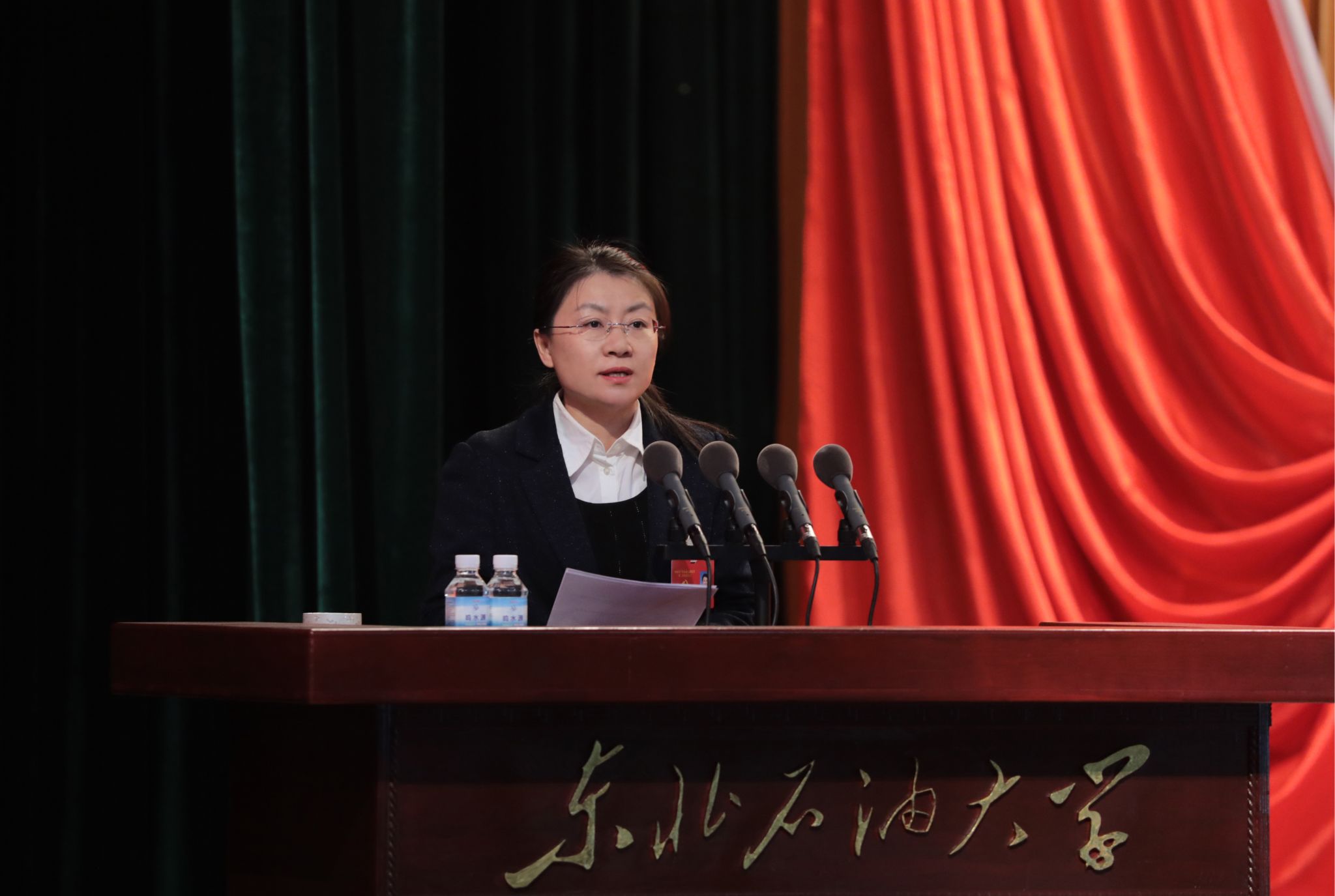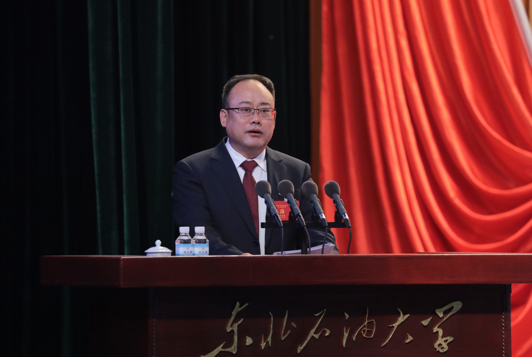 校党委书记付晓飞代表中国共产党东北石油大学第一届委员会,作题为《解放思想,奋楫争先,创建国内著名国际知名的一流能源大学》的报告。报告分为四部分:上次党代会以来的工作回顾;形势分析与发展战略;今后五年的主要任务;加强党的全面领导,引领学校高质量发展。