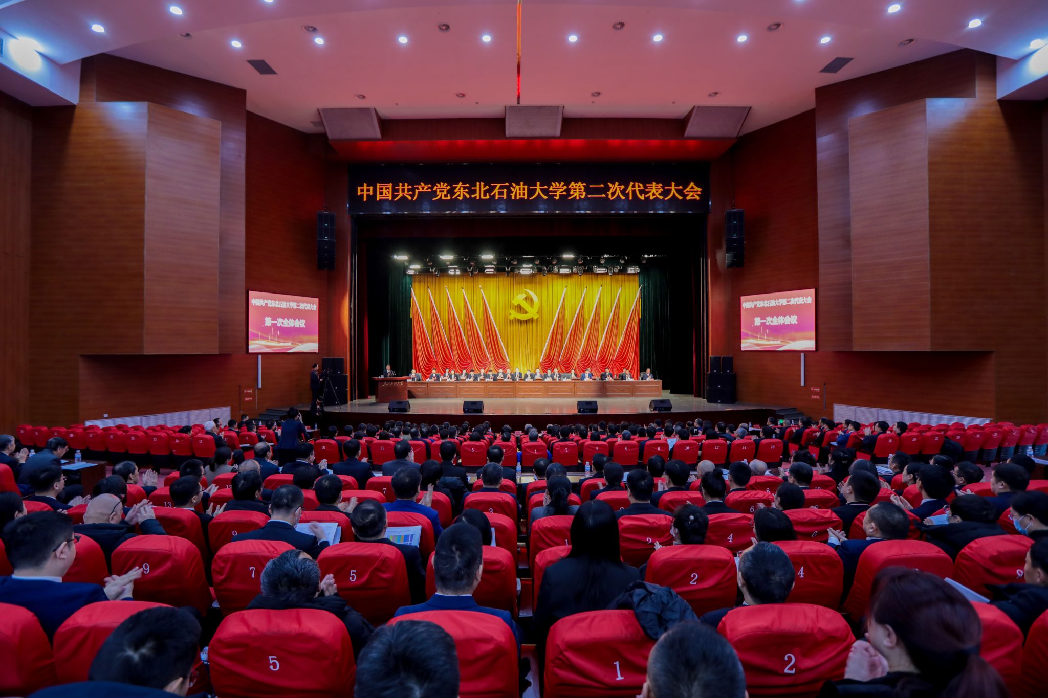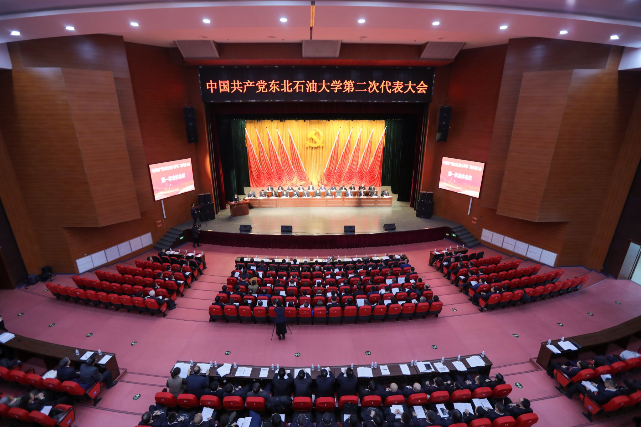 音乐厅气氛隆重热烈。主席台上方悬挂“中国共产党东北石油大学第二次代表大会”的会标。后幕正中,中国共产党党徽高悬,10面鲜艳的红旗分列两侧。音乐厅坐席上方悬挂“强陆、拓海、壮新,争创国内著名国际知名的一流能源大学”横幅。