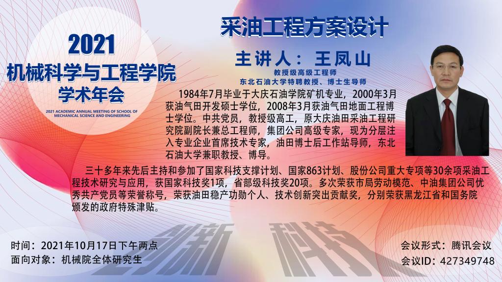 2021机械科学与工程学院学术年会第二场讲座将于10月17日下午两点举行。