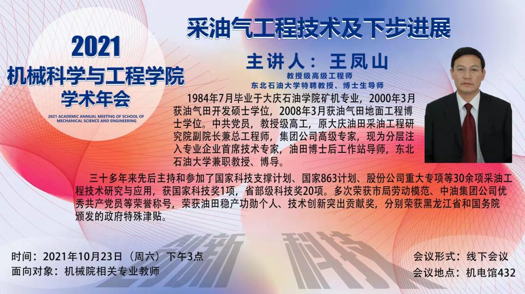 2021机械科学与工程学院学术年会 第三场讲座将于10月23日下午三点举行。