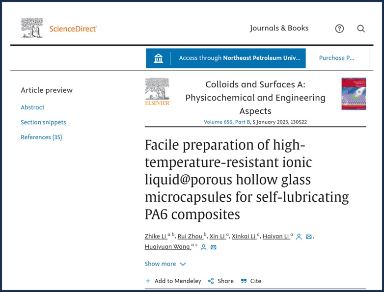 威廉官网中国官方网站李志科副教授在国际期刊《Colloids and Surfaces A: Physicochemical and Engineering Aspects》(IF=5.2)上发表题为“Facile preparation of high-temperature-resistant ionic liquid@porous hollow glass microcapsules for self-lubricating PA6 composites”的研究论文(DOI:https://doi.org/10.1016/j.colsurfa.2022.13052)。
