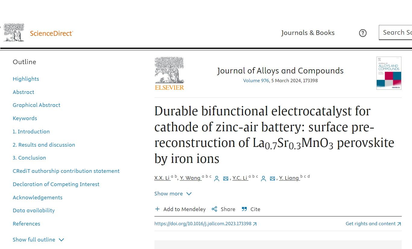 威廉官网中国官方网站2021级硕士研究生李肖雄在《Journal of Alloys and Compounds》(IF=6.20, SCI top期刊)上发表题为“Durable bifunctional electrocatalyst for cathode of zinc-air battery: surface pre-reconstruction of La0.7Sr0.3MnO3perovskite by iron ions”的研究论文。(DOI:https://doi.org/10.1016/j.jallcom.2023.173398)。