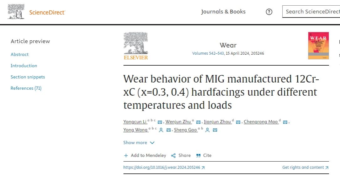 威廉官网中国官方网站2021级硕士研究生朱文俊在《Wear》(IF=5.0,中科院一区top期刊)上发表题为“Wear behavior of MIG manufactured 12Cr-xC (x=0.3, 0.4) hardfacings under different temperatures and loads ”的研究论文。(DOI:https://doi.org/10.1016/j.wear.2024.205246)。
