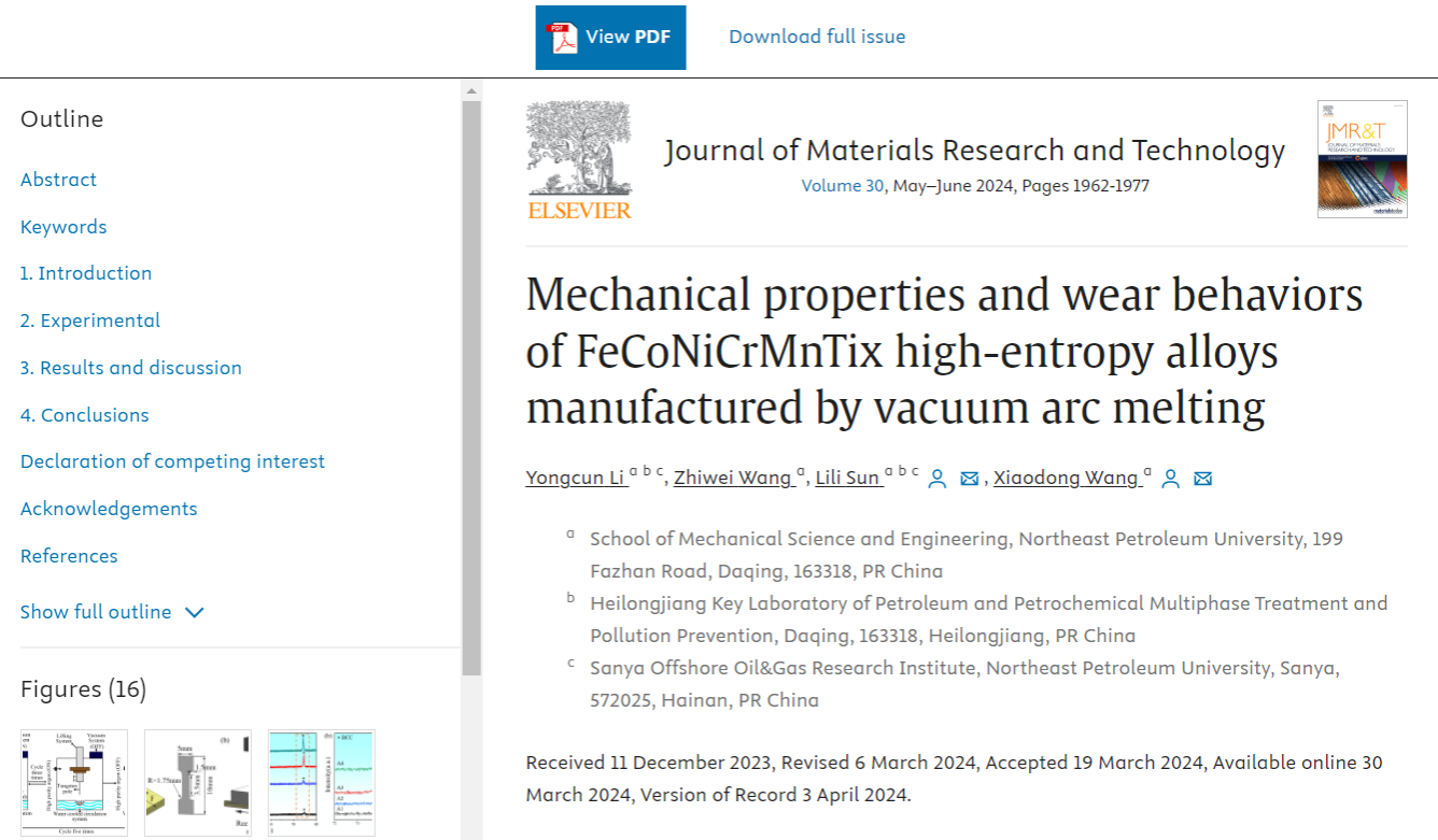 威廉官网中国官方网站2022级硕士研究生王志伟在《Journal of Materials Research and Technology》(IF=6.40,SCI TOP期刊)上发表题为“Mechanical properties and wear behaviors of FeCoNiCrMnTix high-entropy alloys manufactured by vacuum arc melting”的研究论文(DOI:https://doi.org/10.1016/j.jmrt.2024.03.137)。
