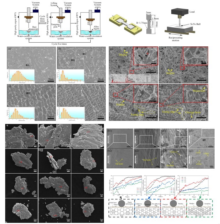 FeCoNiCrMn高熵合金具有高塑性和良好的耐蚀性,在光电、医疗、能源、航空航天领域被认作是非常具有发展潜力的一种材料。但其强度较低,限制了其发展。论文在FeCoNiCrMn高熵合金中通过调控Ti元素的含量来寻求延展性与硬度、强度之间的平衡。结果表明,Ti的加入在单相FCC中引入BCC树枝晶,晶粒细化,合金的强度提高。磨损实验结果显示随着Ti元素含量的增加,摩擦系数逐渐下降,氧化、磨粒和黏着磨损为主要的磨损机制。研究提高了对FeCoNiCrMn高熵合金改性及微观演变规律的认识,对扩大高熵合金材料在耐磨领域中的应用具有一定指导价值。