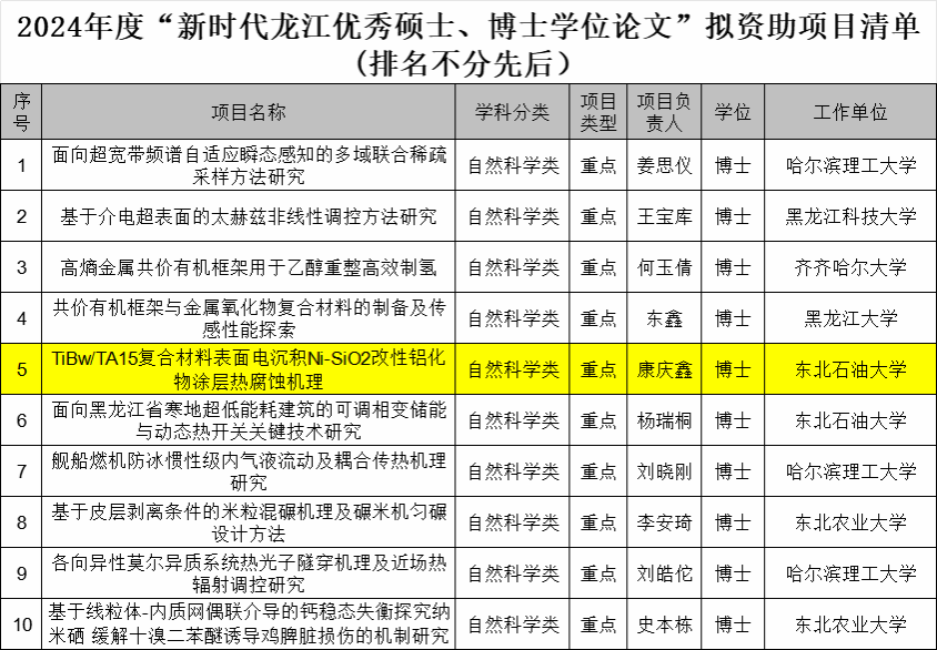 近日,黑龙江省教育厅正式公示了2024年度"新时代龙江优秀硕士、博士学位论文"拟资助项目名单。我校7位学者获资助(重点项目3项,一般项目4项),其中威廉官网中国官方网站青年教师康庆鑫的博士论文《TiBw/TA15复合材料表面电沉积Ni-SiO2改性铝化物涂层热腐蚀机理》成功获批自然科学类重点项目资助。