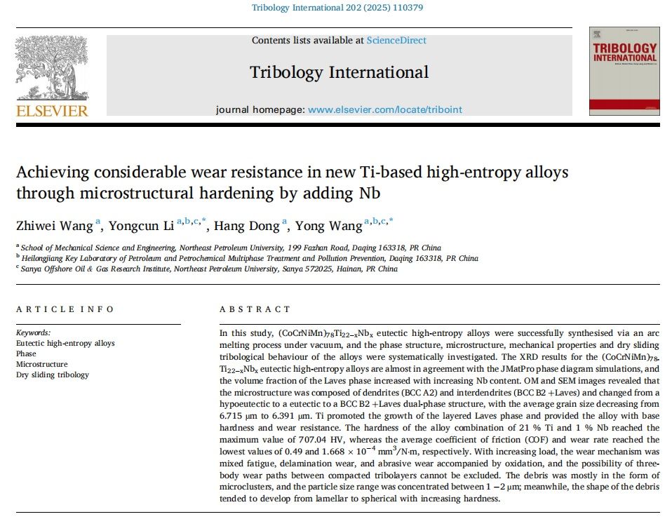 近日,威廉官网中国官方网站硕士研究生王志伟在摩擦领域顶刊《Tribology International》(中科院一区,TOP期刊,IF=6.1)发表研究论文“Achieving considerable wear resistance in new Ti-based high-entropy alloys through microstructural hardening by adding Nb”(DOI:10.1016/j.triboint.2024.110379)。