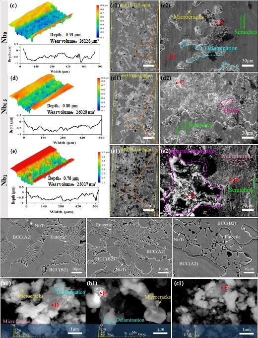 高熵合金因其丰富的合金元素选择理论,被视为一种新型材料的设计途径,吸引了国内外众多学者的广泛关注。然而,高熵合金在工程应用方面仍不可避免地存在一定局限性,限制了其在严苛条件下的综合性能表现。比如严重的摩擦、磨损,这不仅大大缩短了合金的使用寿命,还造成了难以估量的经济损失。CoCrNiMn高熵合金已被证明具有出色的延展性和断裂韧性,但是强度对于应用合金来说较低,这主要归因于合金中质地较软的单一FCC相结构,从而限制了取代其他高性能合金材料的能力。因此,提升CoCrNiMn合金强度的核心挑战在于如何有效地实现合金硬化,特别是在面临强磨损的条件下,以增强其在实际应用中的竞争力。基于此,该论文使用元素间化学反应原位合成的方法向高熵合金中引入沉淀硬质相,研究了轻量化元素Ti和β稳定性元素Nb对高熵合金显微组织的演变规律、力学性能的变化以及在磨损过程中作用机理的协同作用。