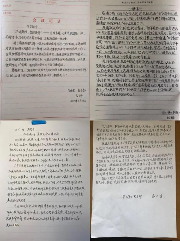 活动中,各党支部书记还组织同学们交流讨论了如何使用网络载体在“停课不停学”期间发挥党员先锋模范作用,同时也讨论了战“疫”期间“逆行者”高尚的道德品质以及牺牲精神,表达了向“逆行者”学习,努力学好科学文化知识,为中华民族伟大复兴贡献力量的信心与决心。