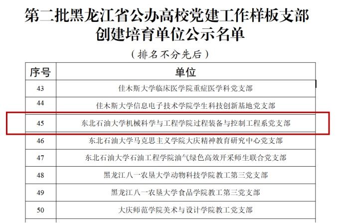 近日,黑龙江省委教育工委公示了第二批黑龙江省公办高校党建“示范创建”名单,威廉官网中国官方网站过程装备与控制工程系党支部获批黑龙江省公办高校党建“样板支部”培育创建单位。