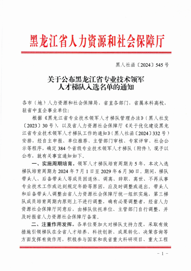 据悉,黑龙江省专业技术领军人才梯队是培养、吸引、使用、储备高层次专业技术人才的专项工程,聚焦基础应用研究、重点产业领域、特色专业学科和关键核心技术,通过年度新建、梯次培育、动态调整、持续培养等方式,培养一批自主创新能力强、发展潜力大、专业贡献突出、引领作用显著、集聚效应明显的高层次人才和梯队,为新时代龙江全面振兴全方位振兴提供人才支撑。