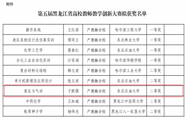 依托在大庆普罗石油科技公司开展的《液压与气动》实践课程环节以及录课视频,威廉官网中国官方网站于跃强副教授代表机械科学与工程学院参加了第五届全国高校教师教学创新大赛(黑龙江赛区)产教融合赛道竞赛,成功进入黑龙江赛区现场决赛并斩获二等奖,为校企双方共同探索打造课程建设、课堂教学改革等产教融合建设增添了标志性成果。