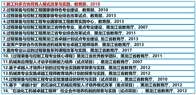 学校和学院从教学改革立项、教材立项、在线课程、精品资源共享课程及研讨课程立项资助等方面鼓励教师进行教学研究与改革。《东北石油大学校内激励奖金分配暂行办法》中按照学校规定,凡属奖励范围内的论文、重大成果、重大立项由学校给予奖励。对教师在学年内完成的其他相关工作,包括超额完成的教学工作量、论文、论著、教学科研成果及学科建设等,由各院部自行制订奖励标准和分配办法。国家级教改项目、国家级和省级教学成果奖、特色专业、教学团队、实验教学示范中心、人才培养模式创新实验区、教学名师奖、精品课(双语教学示范课程)和精品(优秀)教材等给予奖励。