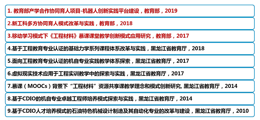 学校和学院从教学改革立项、教材立项、在线课程、精品资源共享课程及研讨课程立项资助等方面鼓励教师进行教学研究与改革。《东北石油大学校内激励奖金分配暂行办法》中按照学校规定,凡属奖励范围内的论文、重大成果、重大立项由学校给予奖励。对教师在学年内完成的其他相关工作,包括超额完成的教学工作量、论文、论著、教学科研成果及学科建设等,由各院部自行制订奖励标准和分配办法。国家级教改项目、国家级和省级教学成果奖、特色专业、教学团队、实验教学示范中心、人才培养模式创新实验区、教学名师奖、精品课(双语教学示范课程)和精品(优秀)教材等给予奖励。